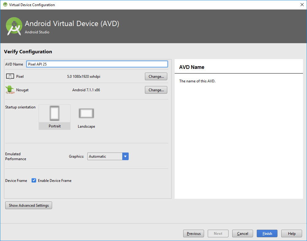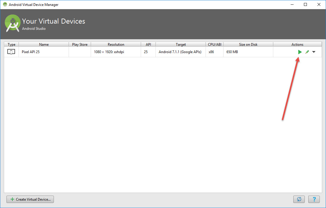 返回到你的 虚拟设备(Your Virtual Devices) 界面,选择你刚刚创建的虚拟设备然后单击 运行这个 AVD 模拟器( Launch this AVD in the emulator )。