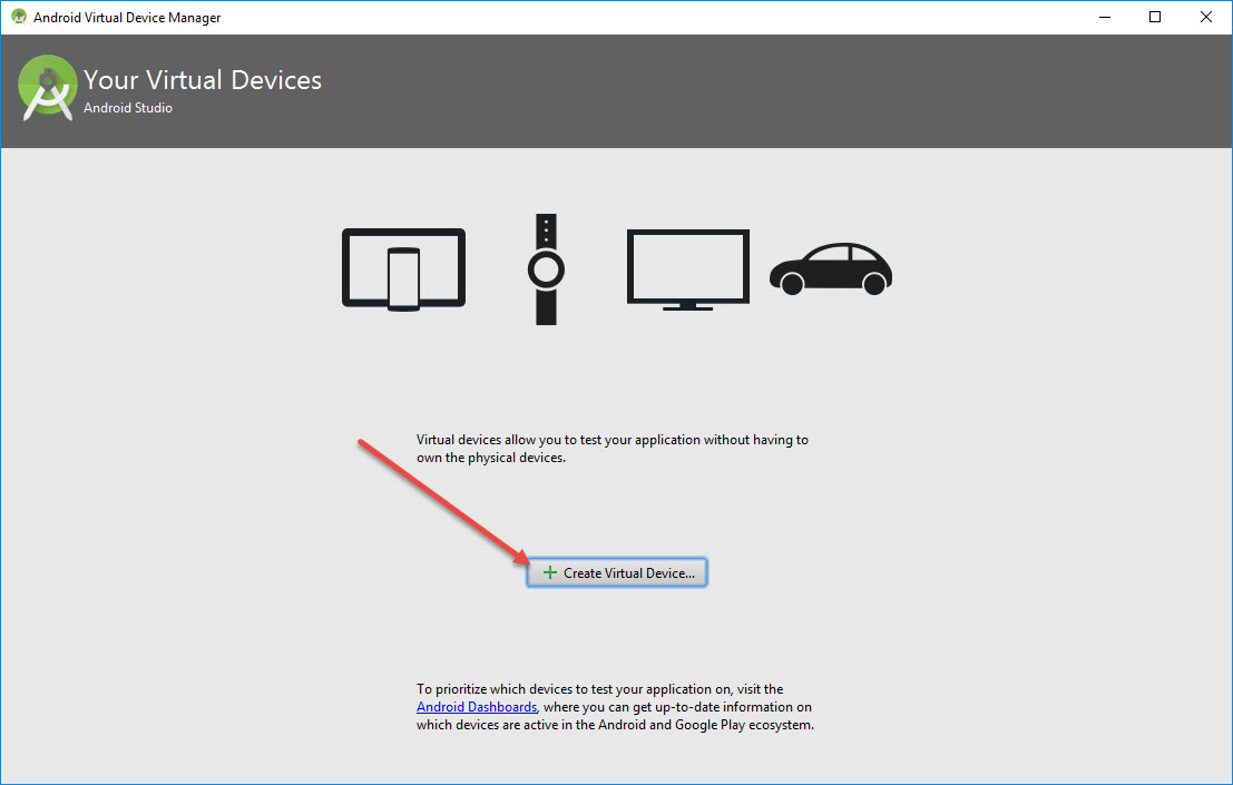 在你的虚拟设备(Your Virtual Devices)界面中,单击创建虚拟设备(Create Virtual Device)。