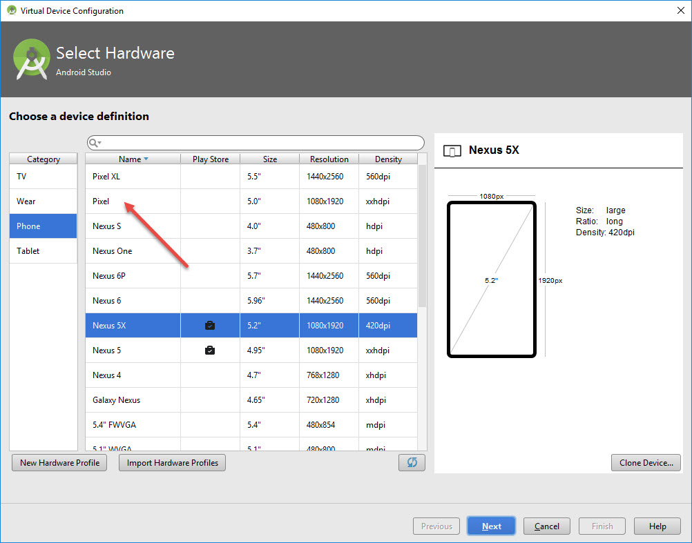 在 选择硬件(Select Hardware)界面中,选择电话设备,例如 Pixel,然后单击 下一步(Next)。
