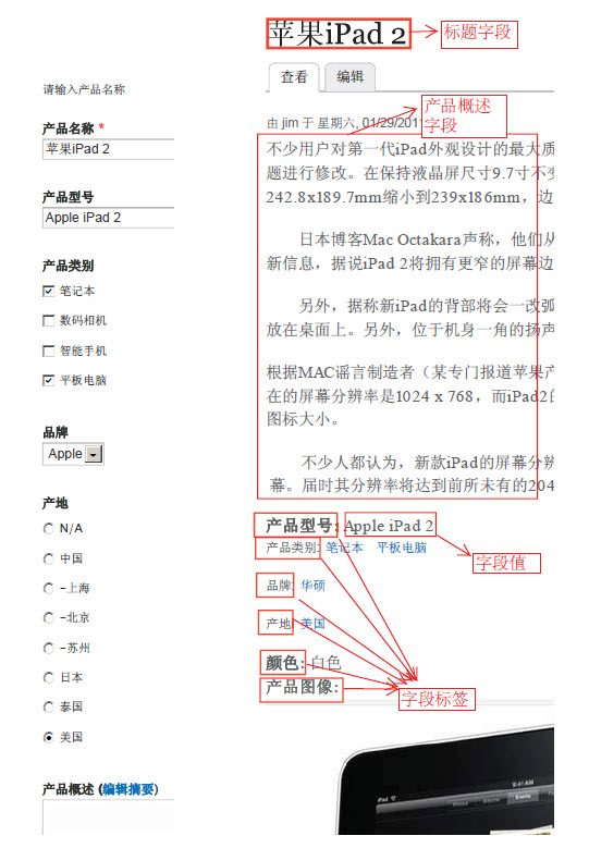 选择列表、复选框、单选按钮、或一个自动完成的字段(用来创建一个自由标签的词汇表)。在选择好字段类型和挂件后,在随后的字段设置页面上可以选择所需要的词汇表,选择其中一个还是多个术语,以及其他的一些设置。同样方法可以添加产品类型、产地分类字段到产品介绍内容类型中。同一个词汇表可以添加到多个内容类型上,在管理字段页面上的” 添加已有字段” 就可以完成此操作。在词汇表分配到内容类型上后,你就可以开始对内容进行分类了。在内容编辑或创建内容时就会显示带有术语的字段了。