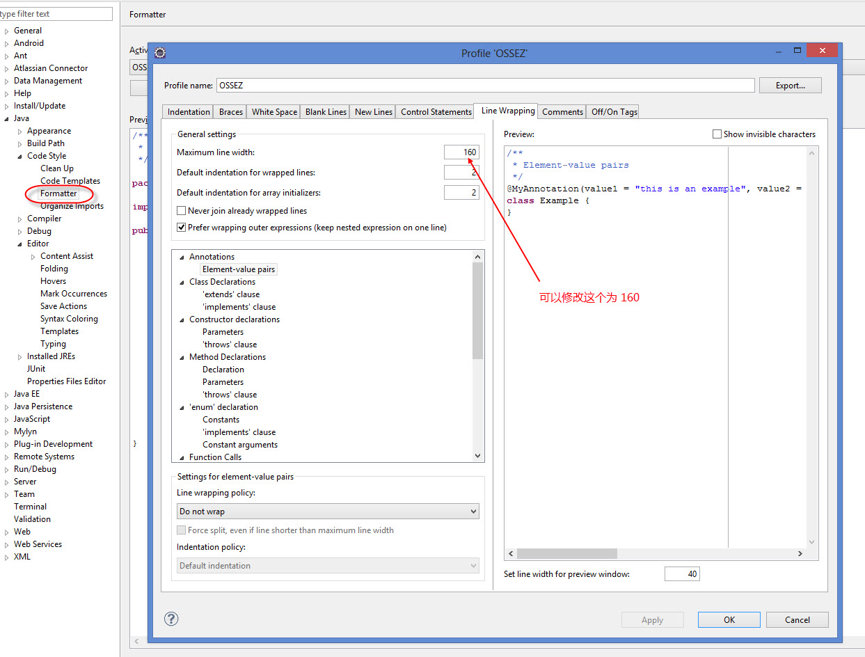 Code line wrapping is set nearby, in Preferences->Java->Code Style- >Formatter, then click on the Edit button and select the Line Wrapping tab. I like a line width of 120 and indent size of 4.