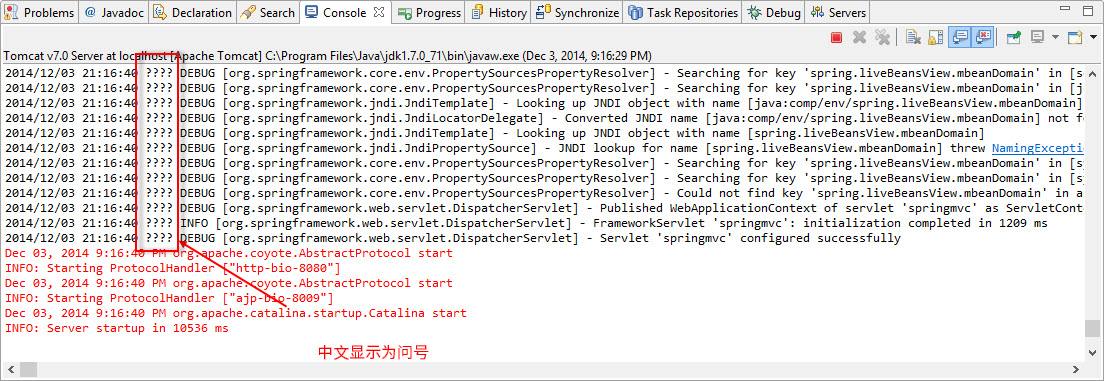 如下图所示,中文的日志内容显示为问号。