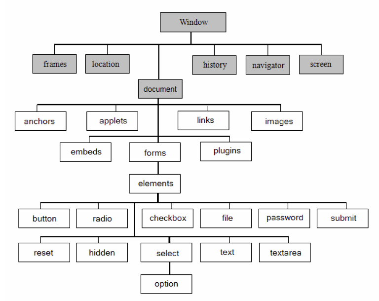注意:上面描述的对象模型中 frames 分别作为顶级对象和Document 对象包含的元素对象而存在,因为当某文档包含框架集时,frames 对象作为该文档对应的Document 对象的元素对象而存在。