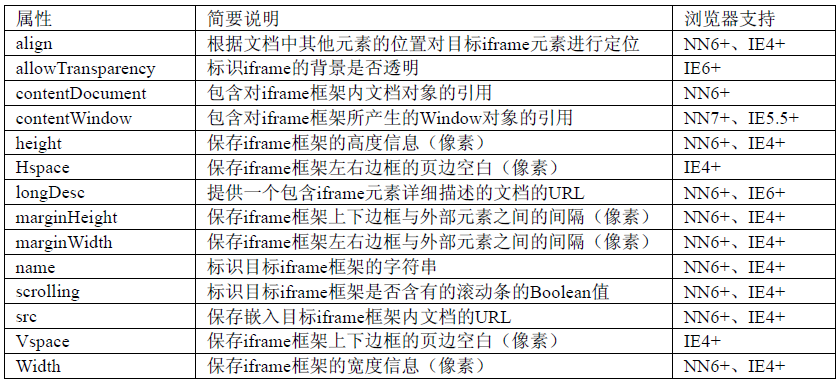 标记对嵌入目标文档到父文档时所产生的对象,表示浮动在父窗口中的目标文档,表列出了其常见的属性及浏览器版本支