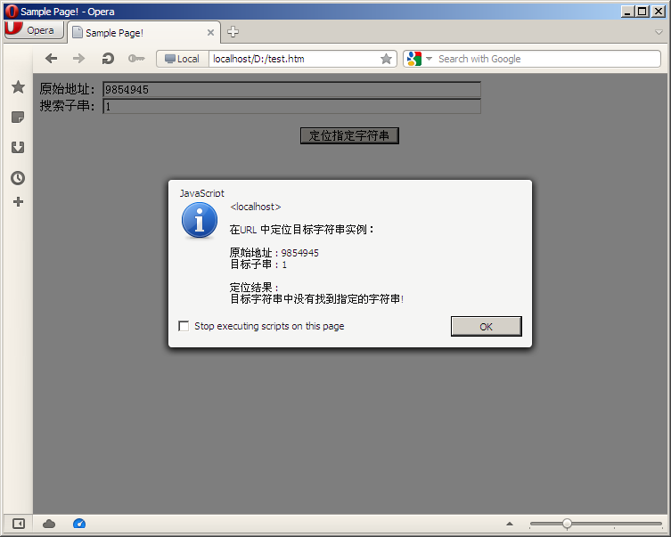 若目标字符串中不存在指定的字符串,则返回如图所示警告框。
