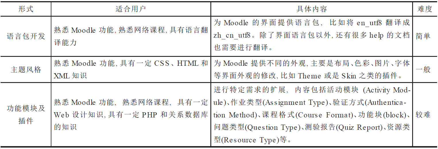 对Moodle开发社区的了解, 第三方的Moodle二次开发重点不是对Moodle的核心代码和模块进行修改, 而是针对其外部功能模块的设计和开发以满足特定的需求, 即围绕Moodle的核心代码进行的模块开发。Moodle对其核心代码和模块有自己的发展计划, 请参考MoodleRoadmap (http://docs.moodle.org/en/Roadmap)。表1描述了Moodle二次开发的形式、内容和适合的用户。