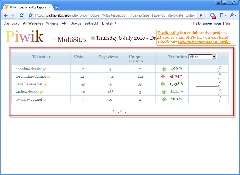 在匿名用户登录的时候,你可能希望显示所有被 Piwik 监控的网站列表。