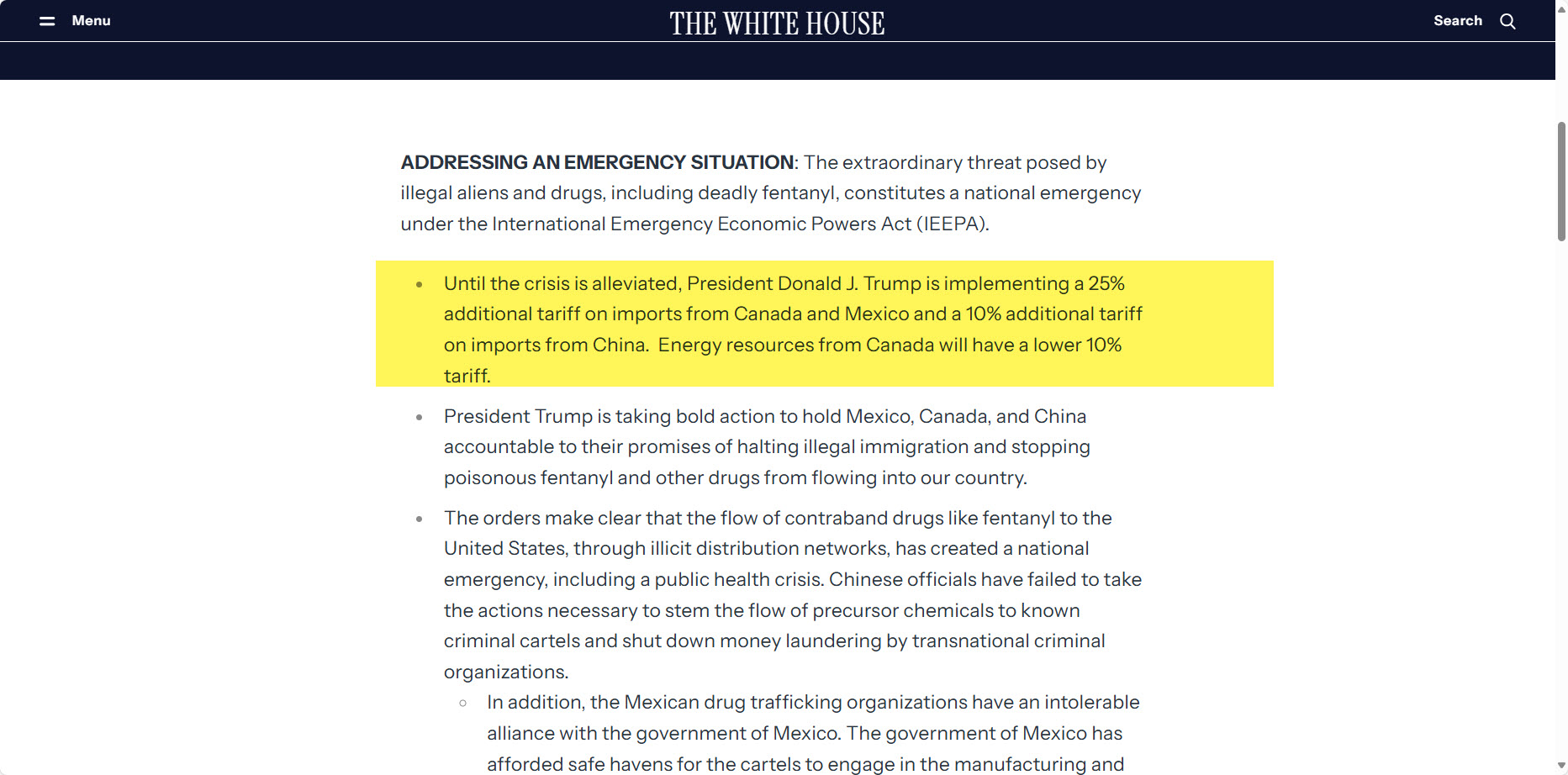根据白宫官方发布的消息,特朗普政府将会对加拿大,墨西哥,中国商品开始征收关税。