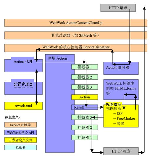 从处理流程上来看,WebWork与Struts 1非常类似,它们的核心都由控制器组成,其中控制器都由两个部分组成: